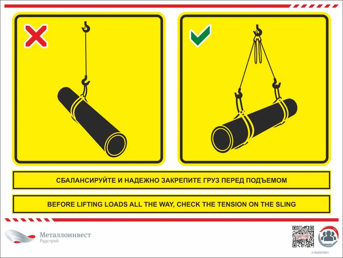 Мультиязычный знак безопасности - Сбалансируйте и надежно закрепите груз перед подъемом